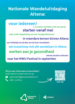 De Nationale Wandeluitdaging biedt een geweldige kans voor volwassenen in de gemeente Altena om op een laagdrempelige manier in beweging te komen. Of je nu om gezondheidsredenen of voor sociale verbinding wilt wandelen, dit programma helpt je om op een veilige en gezellige manier je doelen te bereiken. Sluit je aan bij een van de wandelgroepen en ervaar zelf de voordelen van wandelen!